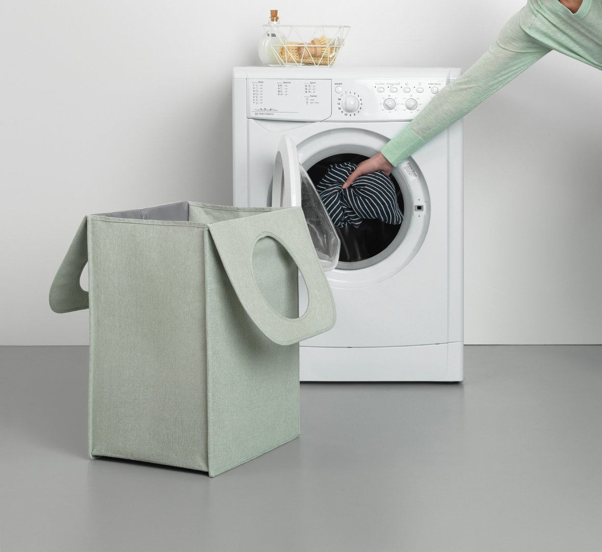 Pārnēsājams – augšdaļa ir salocīta rokturos, lai veļu varētu ērti nogādāt līdz veļas mazgājamai mašīnai
