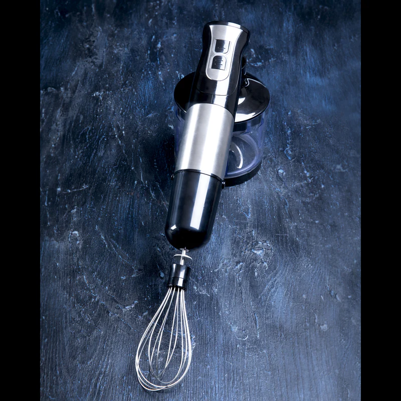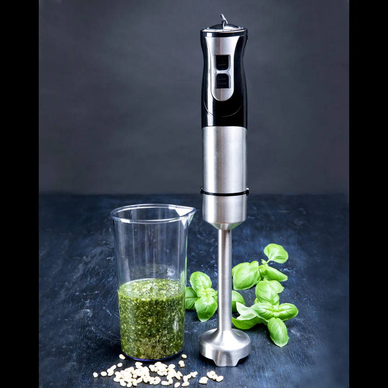 Šis rokas blenderis ir praktisks rīks virtuvē, un tam ir divi ātruma iestatījumi. Izmantojot daudzos piederumus, jūs varat izmantot šo ierīci, lai sajauktu, saputotu un sasmalcinātu mājās gatavotus ēdienus – neatkarīgi no tā, vai tas ir putukrējums, bērnu pārtikas biezenis vai zupu un pesto sajaukšana – To var izdarīt ātri un efektīvi. Šis iegremdējamais blenderis ir viegli lietojams un ātri tīrāms.