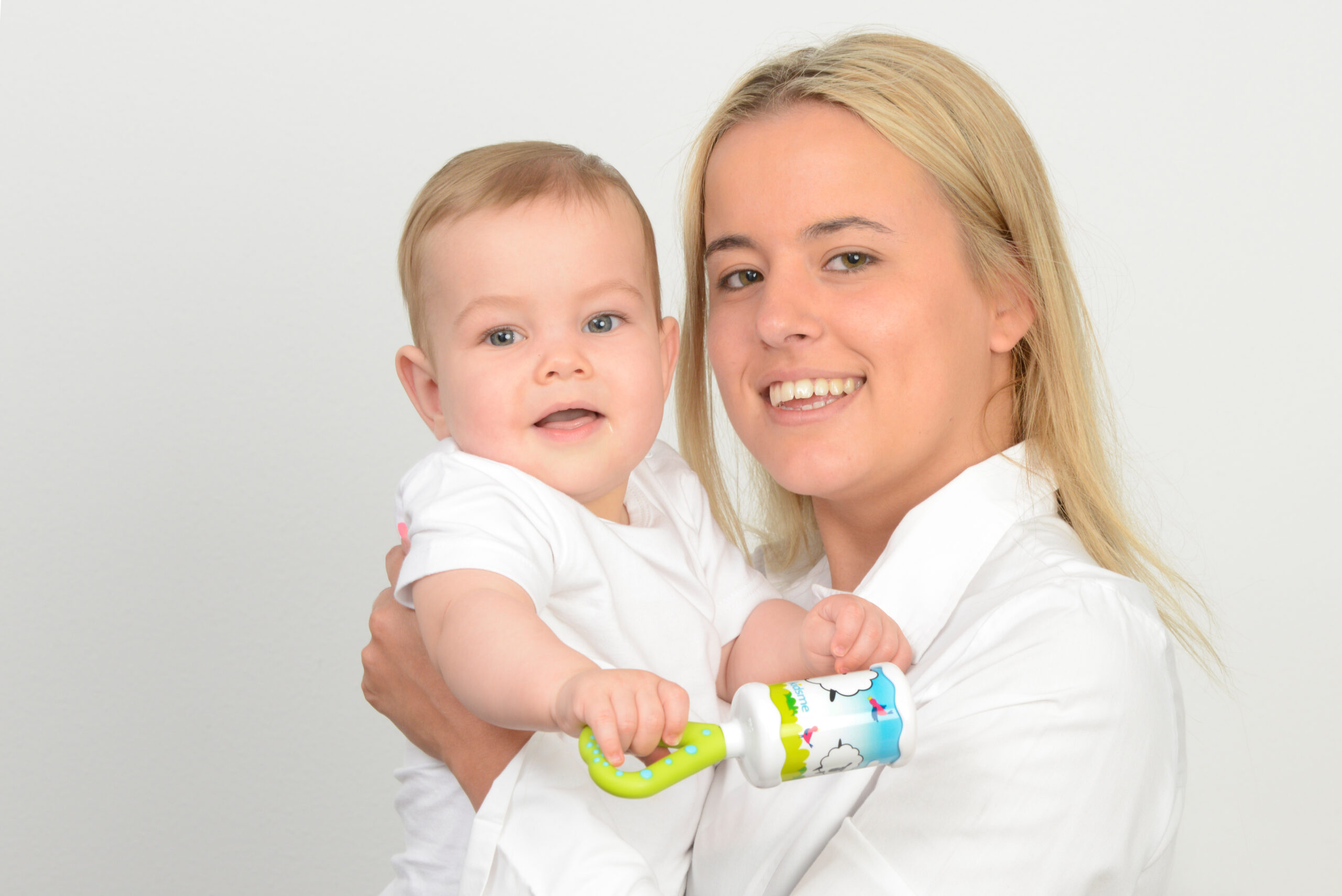 Mīksts rokturis, kas paredzēts augošu zobu sakodienam, maigs skaņas signāls ar krāsainu virsmu