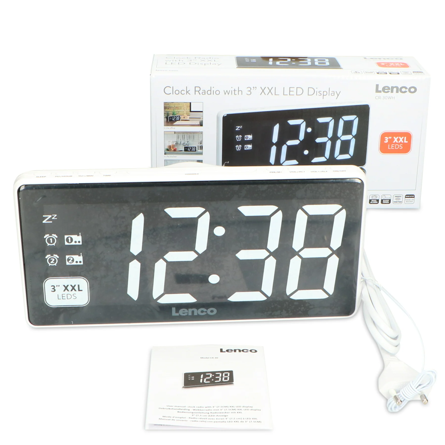 Lenco CR-30 ir eleganti veidots, moderns modinātājs ar plašu noderīgu funkciju klāstu. Lieliskā šī radiopulksteņa skaņas kvalitāte pārsteigs. FM uztvērējs nodrošina visu iecienītāko radio staciju uztveršanu. Vienkāršās dizaina formas līnijas padara Lenco CR-30 par perfektu papildinājumu jebkuram naktsgaldiņam. Nav sarežģītu pogu un funkciju; tam ir lieliska modinātāja funkcija un precizitāte, uz kuru varat vienmēr paļauties. Gadījumos, kad notiek elektrības padeves pārrāvums, šis modinātājs pamodinās vienmēr laikus, pateicoties papildus iespējai tam darboties ar baterijām. Lai gan modinātājs ir kompakta izmēra, tam ir liels un labi saredzams XXL LED displejs ar baltas krāsas laika rādījumu un informāciju. Jūs varēsiet skaidri redzēt laiku pat pamostoties nakts vidū. Lenco CR-30 ir dubultā modinātāja funkcija, kas pamodina katru savā paredzētajā laikā. Papildus tam ir atliktās modināšanas funkcija, lai vēl dažas minūtes baudītu savu iecienīto radio staciju vai vēl pagulētu.