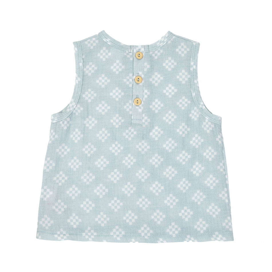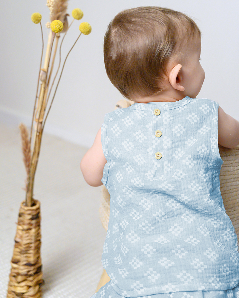 Jaunums mūsu kolekcijā: šis vasaras mazuļu krekliņš bez piedurknēm siltām dienām. Izgatavots no 100% muslīna kokvilnas ar jauku rakstu, tas ir skaists un piemīlīgs vienlaikus. Ērts krekliņš, kuram noteikti jābūt jūsu mazuļa vasaras komplektos. Protams, ar kvalitātes marķējumu Oeko-Tex®.
