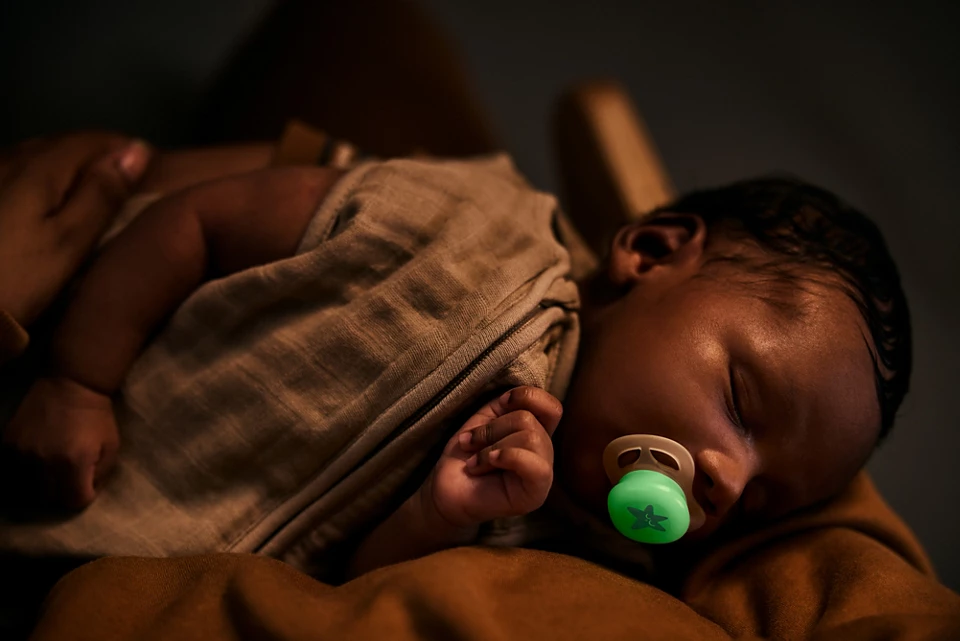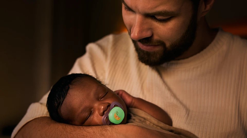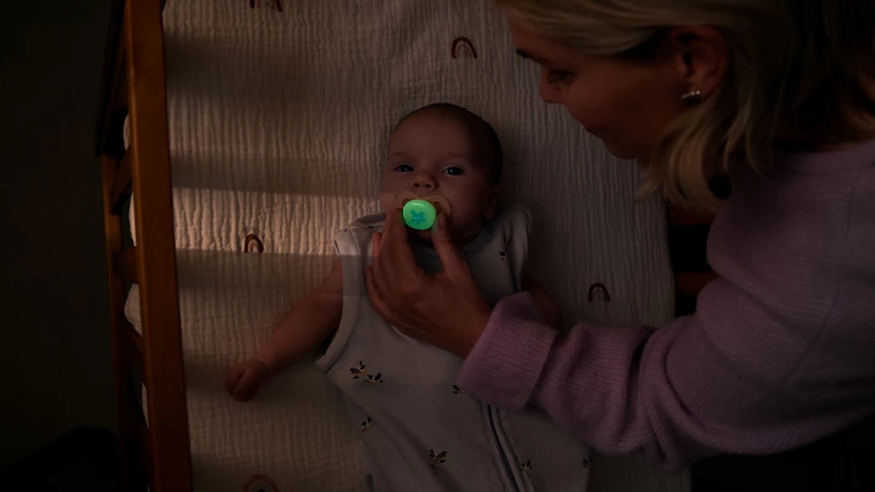 Philips Avent ultra start Nighttime knupja vāciņš maigi spīd tumsā. Tāpēc ir vieglāk atrast jaundzimušā bērna knupīti, kad gaisma nodziest.
