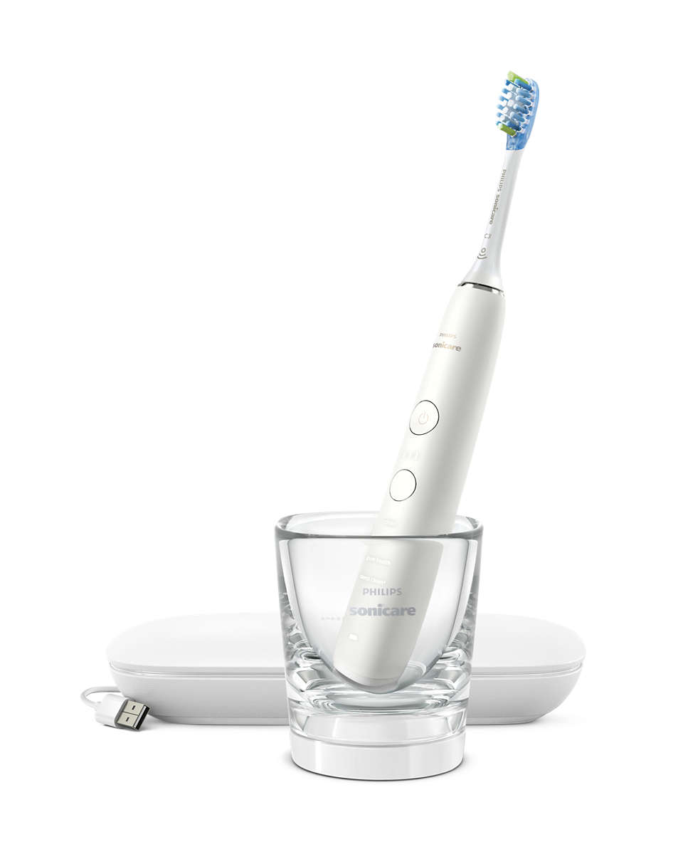 DiamondClean 9000 palīdzēs jums uzlabot un uzturēt veselīgus zobu tīrīšanas paradumus starp zobārstu pārbaudēm. Iebūvētie viedie sensori jūs informēs, ja pielietosiet pārāk lielu spiedienu, un, pievienojot jūsu zobu tīrīšanas pieredzi Sonicare lietotnei, personalizēts progresa ziņojums palīdzēs jums aplūkot, kā laika gaitā ir uzlabojusies jūsu zobu tīrīšana.
